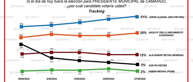 La medición fue realizada de manera semanal y a través de este tracking se da a conocer el margen entre los candidatos y la candidata. La medición fue hecha de manera aleatoria a 400 camarguenes y arrojó los siguientes resultados: