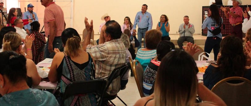 Aldama.- 17 de mayo del 2024. Tony Meléndez, candidato a la Diputación Federal por el V Distrito, estuvo presente en una reunión que se llevo a cabo ayer en el salon ejidal de Aldama, donde se reunieron madres para seguir festejando su día.