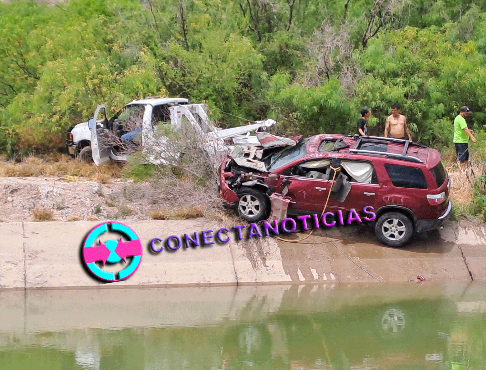 En el lugar se apersonaron agentes de policía elementos de vialidad y bomberos municipal, así como paramédicos de URGE, fueron personas de las comunidades del Ojo Caliente y Altavista, los que se introdujeron a las frías agua del mencionado canal, para enganchar y sacar al vehículo de la marca GMC Acadia 2007 color Guinda.