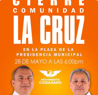 Hoy en punto de las 6 de la tarde los candidatos de Movimiento Ciudadano en el municipio de La Cruz cerrarán en la cabecera municipal, dicho encuentro será en la explanada de presidencia municipal, cabe destacar que en tal comunidad ya habían recorrido casa por casa, solo faltaba el cierre.