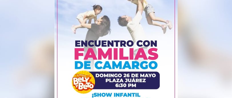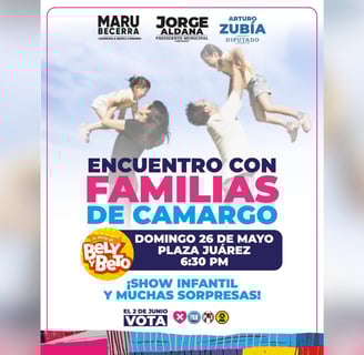 Camargo.- Este domingo, los candidatos del PAN-PRI-PRD Jorge Aldana, Arturo Zubía y Maru Becerra invitaron a las familias camarguenses a disfrutar de un evento en la Plaza Juárez a las 6:30 de la tarde dónde se contará con un show infantil.