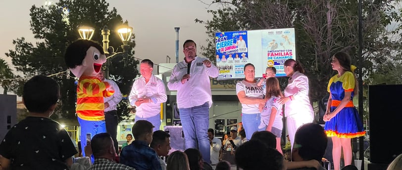 El candidato a la Presidencia Municipal de Camargo Jorge Aldana, que abandera los partidos PAN-PRI-PRD habló esta tarde en el evento que organizaron para las familias en la Plaza Juárez.