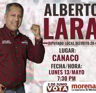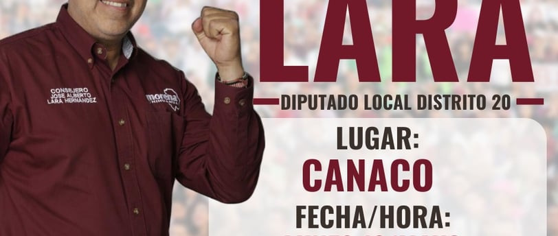 Mañana, lunes, se llevará a cabo una importante reunión en la que el candidato a la diputación local por el XX distrito, por MORENA, Alberto Lara, estará presente junto con socios de la Cámara Nacional de Comercio. El objetivo de este encuentro es exponer y recibir ideas sobre cómo atraer apoyo al sector empresarial y comercial de Camargo.