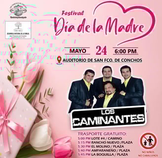 San Francisco de Conchos. - 7 de mayo de 2024. El H. Ayuntamiento de San Francisco de Conchos, en coordinación con el Dif Municipal -San Francisco De Conchos- 2021-2024 invita a todas las madres de este Municipio a festejarse a lo grande. Este próximo viernes 24 de mayo a partir de las 6:00 p.m. En el Auditorio Municipal de San Francisco de Conchos. Con la música “LOS CAMINANTES”, así que no puedes perderte este festival dedicado especialmente para las reynas del Hogar. Trasporte gratuito para que nadie falte Entérate de los horarios de tu comunidad NO NIÑOS, NO CABALLEROS